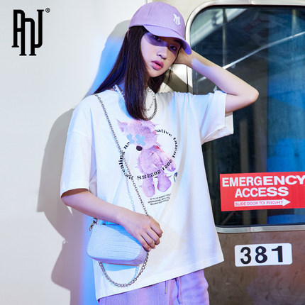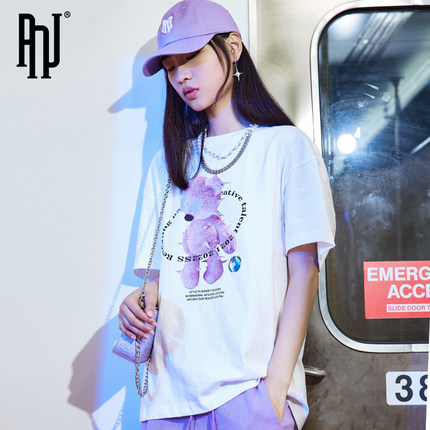 PNJ short sleeve T-shirt women's fashion brand cartoon printed white glow five point sleeve